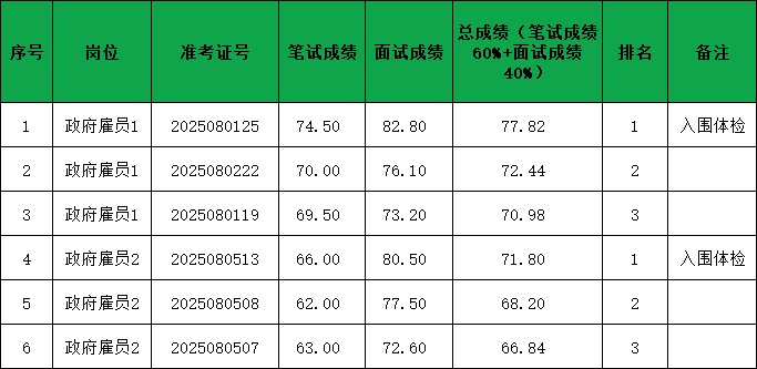 根據(jù)《揭陽市揭東區(qū)統(tǒng)計局2025年公開招聘政府雇員公告》,經發(fā)布公告、組織報名、資格審查、組織筆試和面試,現(xiàn)將考試成績和入圍名單公示如下: