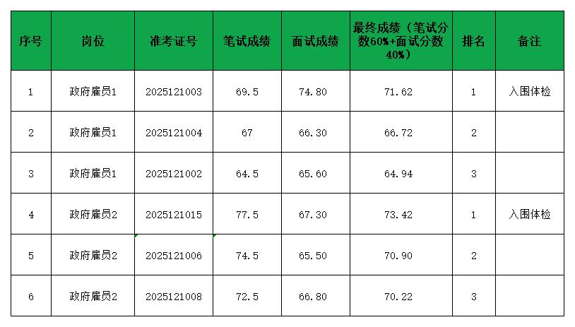 根據(jù)《中共揭陽市揭東區(qū)委宣傳部、揭陽市揭東區(qū)婦女聯(lián)合會2025年公開招聘政府雇員公告》,經(jīng)發(fā)布公告、組織報名、資格審查、組織筆試和面試,現(xiàn)將考試成績和入圍名單公示如下: